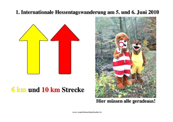 Die Wanderfreunde Hatzbachtal in Stadtallendorf führen anlässlich des 50. Hessentages am 05. und 06. Juni 2010 erstmals mit der 1. Internationalen Hessentagswanderung eine Internationale Volkswanderung an einem Hessentag durch. Höhepunkt und zugleich traditionell Abschluss des Hessentages 2010 ist der große Festzug am Sonntag, den 06. Juni 2010, um 13.00 Uhr. Zu den mehr als 150 Gruppen aus vielen hessischen Städten und allen Landkreisen, die in der Hessentagsstadt den Reiz und die Vielfalt des Landes zeigen werden, gehören unter anderem zahlreiche Musik- und Trachtengruppen. Fast vier Stunden lang werden Einheimische und Gäste aus Nah und Fern das prächtige Schauspiel bewundern können, wenn sich der Festzug durch die Hessentagsstadt schlängelt. Die Hessentagsstraße mit den vielen Verkaufständen und Bühnen lädt zum Bummeln, Einkaufen und an den Aktionsbühnen zur musikalischen Unterhaltung ein. Es bietet sich daher an, die Teilnahme an der 1. Internationalen Hessentagswanderung mit einem Besuch der Hessentagstraße und des Festzugs zu verbinden. Start und Ziel der Wanderstrecke ist in der Bärenbachhalle in Stadtallendorf, in der Nähe der Hessentagstraße gelegen. Die Wanderstrecken führen durch das große Waldgebiet des Herrenwaldes vorbei an Dorfwüstungen und Bunkeranlagen aus dem Zweiten Weltkrieg. In Stadtallendorf befand sich nämlich während des Zweiten Weltkrieges das größte Sprengstoffwerk Europas. Auch heute noch sind zahlreiche Bunkeranlagen im Wald erhalten. Die Wanderstrecken führen an einigen von ihnen vorbei. Nutzen Sie die Gelegenheit und verbinden Sie eine attraktive Wanderung mit dem Besuch des Hessentages.