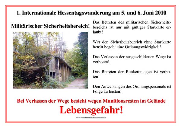 Nach der Kontrolle geht es dann durch den militärischen Sicherheitsbereich. In diesem Bereich sind noch einige Gebäude der Munitionsfabrik mit den zur Tarnung mit Bäumen bepflanzten Dächern erhalten. Die Bundeswehr hat im Hinblick auf den Hessentag den Wanderfreunden Hatzbachtal eine Sondergenehmigung zur Nutzung der Wege im militärischen Sicherheitsbereich erteilt. Als militärischer Sicherheitsbereich ist das Betreten des WASAG-Geländes normalerweise verboten und wird mit Geldbußen geahndet. Für die Wanderer bei der Hessentagswanderung besteht somit die einmalige Gelegenheit das stadtgeschichtlich bedeutsame WASAG-Gelände mit den zahlreichen Resten der früheren Munitionsfabrik zu besichtigen. Diese Genehmigung bezieht sich ausdrücklich nur für Wanderer mit Startkarte. Ohne Startkarte ist auch am Hessentag das Betreten des Geländes verboten und wird als Ordnungswidrigkeit verfolgt.