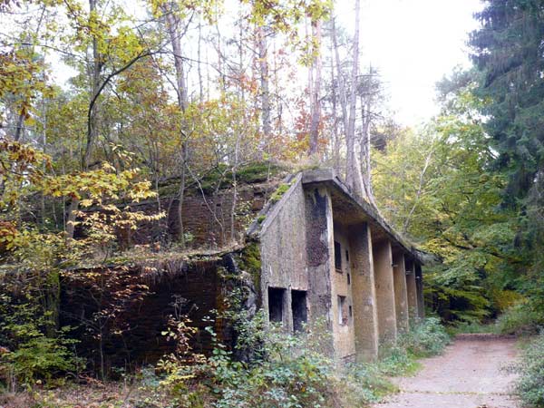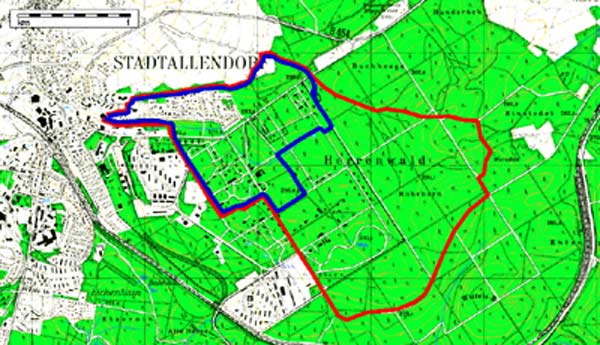 Die Wanderstrecke führt von der Bärenbachhalle schon nach wenigen Metern aus dem Ort hinaus in ein kleines Wäldchen. Die südlich der Wanderstrecke gelegene Siedlung wurde auf den Resten der Munitionsbunker der früheren Munitionsfabrik errichtet. Im Zuge der Kriegsvorbereitungen wurde seit 1938 im Herrenwald mit dem Bau der beiden Munitionsfabriken „Allendorf“ und „Herrenwald“ begonnen. Das Werk Allendorf wurde von der Dynamit Nobel AG (DAG), das Werk Herrenwald von der Westfälisch-Anhaltische Sprengstoff-Aktien-Gesellschaft (WASAG) betrieben. Noch heute spricht man in Stadtallendorf vom DAG-Gebiet bzw. vom WASAG-Gelände. Beide Munitionsfabriken wurden während des Zweiten Weltkrieges ständig erweitert und nahmen zusammen mit rund 700 Gebäuden eine Fläche von 850 ha ein und waren damit die größte Munitionsfabrik in Europa. In den Fabriken wurden unter anderem auch die legendären Wunderwaffen V1 und V2 hergestellt.