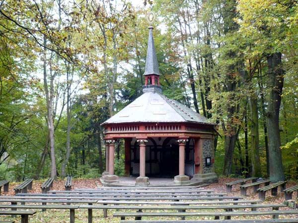 Die Wanderstrecke führt hier an einem Postenstand des Munitionswerkes vorbei. Nach ca. 800 m verlässt die Wanderstrecke den Wald und stößt auf einen von der Altstadt kommenden Weg. Auf diesem Weg zur Wahlfahrtskapelle Mariabild bei der Dorfwüstung Forst geht es dann wieder in den Wald. Die Wallfahrten zur heutigen Wahlfahrtskapelle sind bereits seit dem 17. Jahrhundert belegt. Auf diesem historischen Weg geht die 10 km lange Wanderstrecke bis zur Wahlfahrtskapelle Mariabild. Zunächst führen beide Wanderstrecken auf dem alten Pilgerweg in den Wald und überqueren die Niederrheinische Straße. Hier trennen sich die beiden Wanderstrecken. Die 10 km lange Wanderstrecke führt weiter durch den Wald über die Rhein-Weser-Wasserscheide zum Walddistrikt Einsiedel bis zur Wahlfahrtskapelle Mariabild, die man nach einem kurzen Anstieg erreicht. Hier ist eine Kontrollstelle, an der sich die Wanderer ausruhen oder bei einem Imbiss oder einem Getränk stärken können. Von der Bärenbachhalle bis zur Wahlfahrtskapelle hat der Wanderer etwas mehr als 4 km zurück gelegt. Die Wahlfahrtskappelle wurde 1894 an Stelle eines Marienbildes errichtet. Beim Bau der Marienkappelle legte man Mauerreste frei, die man irrtümlich als Reste der Kirche der hier gelegenen Dorfwüstung Forst deutete. Jüngere Untersuchungen haben aber ergeben, dass die Gebäudereste aus dem 17. Jahrhundert stammen. Es handelt sich hier vermutlich um die Reste einer Mönchsklause. Der Name des Walddistrikts Einsiedel rührt nämlich von Mönchen her, die der Sage nach in diesem Wald als Einsiedler in ihrer Klause lebten und im 30-jährigen Krieg ermordet worden sein sollen. Die Ermordung der Mönche hat vermutlich in der Zeit von 1633 bis 1635 stattgefunden, denn in diesen Jahren wurden die Ortschaften in der Gegend von Stadtallendorf mehrfach durch kaiserliche Truppen geplündert, wobei es auch zu Morden an der Bevölkerung kam. Seit dem 17. Jahrhundert sind jedenfalls Wallfahrten aus Allendorf und anderen katholischen Gemeinden der Umgebung zur Wüstung Forst nachweisbar. Ob diese bereits noch zu Lebzeiten der Mönche einsetzten oder erst nach deren Ermordung, ist nicht bekannt.