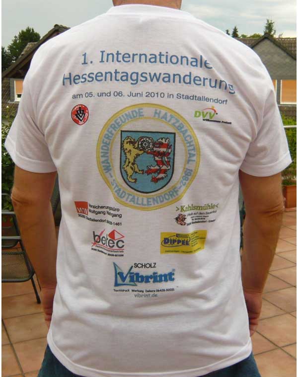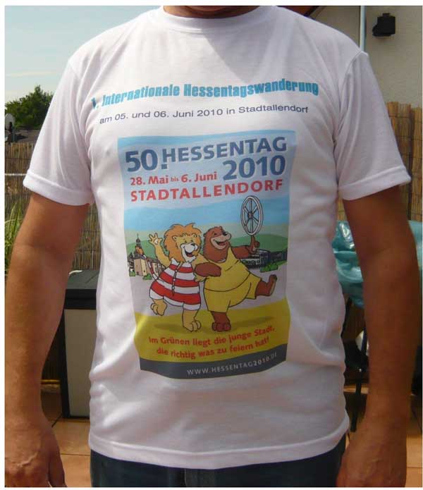 Bereits jetzt werben die Wanderfreunde Hatzbachtal mit T-Shirts landesweit auf Wandertagen für dieses Wanderereignis 2010 in Stadtallendorf. Die weißen Funktionsshirts zeigen auf der Vorderseite das Hessentags-Motiv mit Löwe und Bär und die Aufschrift „1. Internationale Hessentagswanderung am 5. und 6. Juni 2010“. Auf der Rückseite ist unter der gleichen Aufschrift das Stadtwappen sowie Sponsorenwerbung aufgedruckt. Dank der Sponsoren „betec Dachmeisterbetrieb“, „Elektro-Dippel“, „Ferienhof Kahlsmühle“, „Versicherungsbüro Wolfgang Nahrgang“ und Textildruck Vibrint Scholz“ können die Funktionsshirts mit dem Hessentags-Motiv für nur 12,50 Euro angeboten werden. Vereinsmitglieder erhalten das Hessentags-T-Shirt sogar für nur 10,00 Euro.