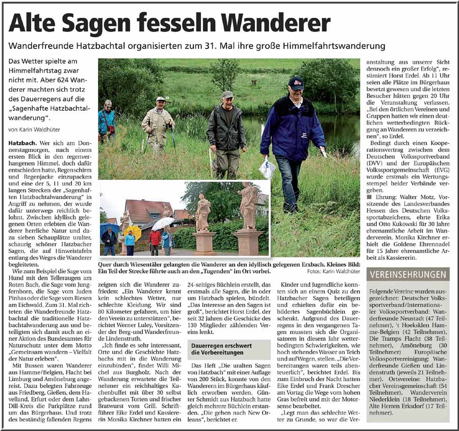 An drei Schutzhütten im Wald hatten die Wanderfreunde Kontrollenstellen errichtet, an denen die hungrigen und durstigen Wanderer mit kühlen Getränken, Tee und einem kleinen Imbiss versorgt wurden. Angesichts der zahlreichen Wanderer war dies zeitweise Schwerstarbeit für die freiwilligen Helfer dort. Auch am Start- und Zielort, dem Hatzbacher Bürgerhaus, gab es nur wenige Ruhemomente für die Helfer. Durch die zahlreichen Wanderer war in der Mittagszeit nur schwer ein Sitzplatz zu bekommen. Ob vor der Kuchentheke, vor der Erbsensuppenausgabe, vor dem Grill oder an der Theke, überall bildeten sich Schlangen.