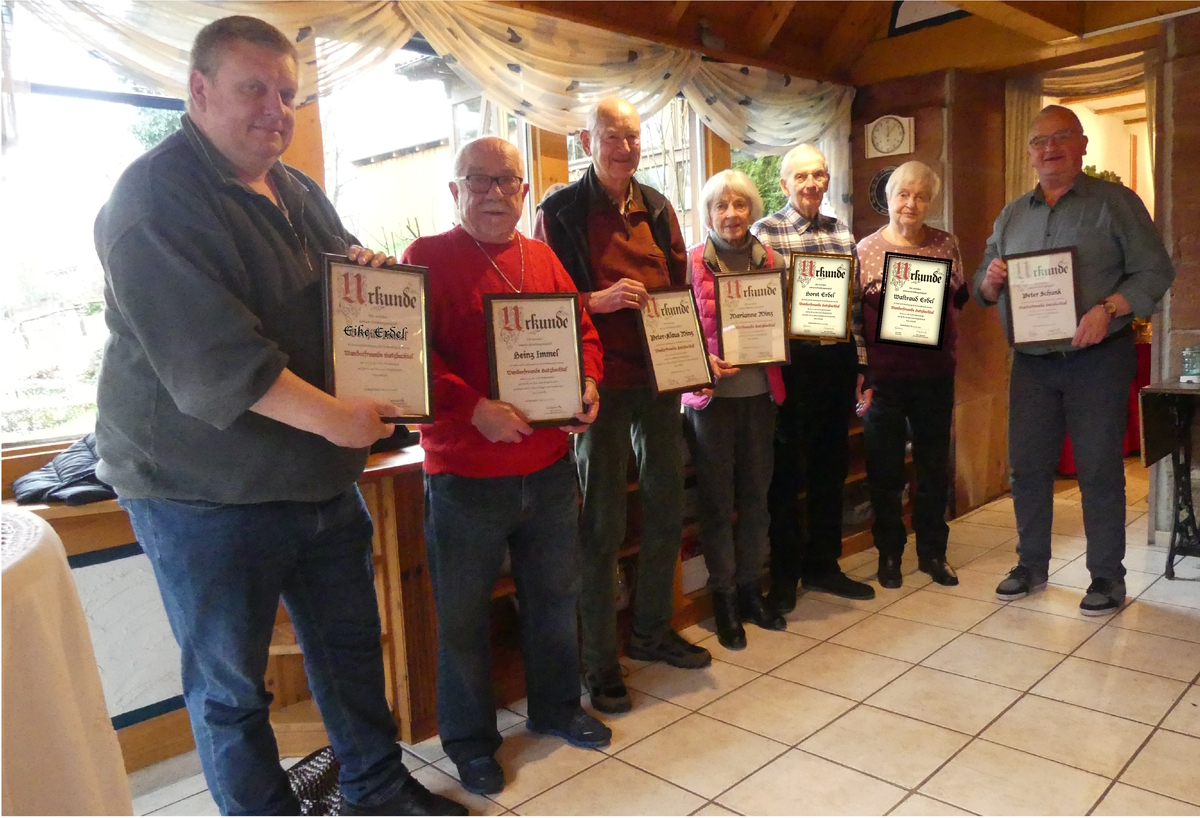 Außerdem wurden die Wanderfreunde Anneliese Immel, Albert Lembach und Hans-Werner Happel für 25 Jahre Vereinstreue mit der goldenen Ehrennadel des Wandervereins und einer Urkunde geehrt. Bronze ging an Margarete Kreher, die seit 10 Jahren Mitglied im Wanderverein ist. Für den verhinderten Wanderrfreund Dieter Knoch nahm Karin Knoch die goldene Ehrennadel entgegen. Für die ebenfalls verhinderte Wanderfreundin Ursula Lembach nahm Albert Lembach die silberne Ehrennadel für 20 Jahre Vereinstreue entgegen.