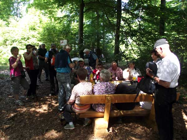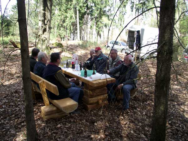 ![]() Die Sitzgruppe steht aber auch wirklich an einem tollen Platz mitten im Wald. Trotzdem: Die Karawane zieht weiter, der Wanderer der hat Durst.......... |