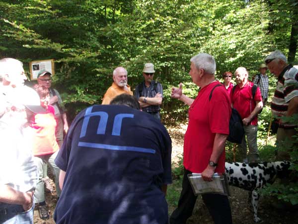 Vergangenen Dienstag, den 18 Juni, drehte Jochen Schmidt, Redakteur der hr-Sendung „Wandervolles Hessen“, einen Beitrag über den Wanderweg „Rund um den Wetzstein“ bei Stadtallendorf-Hatzbach für die Sendung „Die beliebtesten Wanderwege der Hessen“, die voraussichtlich am 3. Oktober ausgestrahlt wird. Knapp 50 Wanderer waren über fünf Stunden bei großer Hitze unterwegs für einen am Ende drei Minuten langen Fernsehbeitrag. hr-Redakteur Jochen Schmidt war begeistert, dass trotz der kurzfristigen Festsetzung des Drehtermins an einem Wochentag so viele Wanderer erschienen waren. Laut Schmidt sind die Wanderfreunde Hatzbachtal die größte Wandergruppe, die in der Sendung zu sehen sind. Unter den Gästen, die der Vorsitzende der Wanderfreunde Hatzbachtal Horst Erdel begrüßen konnte, war auch Stadtallendorfs Bürgermeister Christian Somogyi, der Hatzbacher Ortsvorsteher Frank Drescher und der Leiter der Revierförsterei Wolferode, Matthias Sandrock.